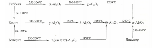 Корунд может быть получен искусственно в результате термического разложения ромбической модификации АlOОН - диаспора или полиморфных переходов метастабильных форм Аl2Оз (γ, η и т.д.), которые образуются при разложении кристаллических модификаций Аl(ОН)з - гиббсита и байерита и АlOОН — бемита. Эти процессы могут быть представлены следующей схемой