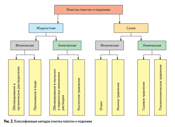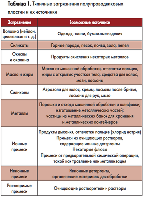 Перед тем как приступить к операциям очистки поверхности, необходимо знать природу, характер и источник загрязнений. Поверхностные атомы пластин (подложек) по сравнению с объемными имеют большое количество ненасыщенных химических связей, чем объясняется высокая адсорбционная способность, приводящая к загрязнениям. В зависимости от типа взаимодействия загрязняющего вещества с поверхностью различают физическую и химическую адсорбцию. Физическая адсорбция является результатом межмолекулярного (силы Ван дер Ваальса) электростатического кулоновского взаимодействия. Адсорбированные частицы, совершая тепловые движения, могут преодолеть силы связи и оторваться (десорбция) от поверхности, то есть адсорбция — процесс обратимый. Физически адсорбированные загрязнения располагаются на поверхности в несколько слоев и сравнительно легко удаляются чистым растворителем, отжигом (испарением) в вакууме. Химическая адсорбция является необратимым процессом, так как между загрязнениями и поверхностью образуются прочные химические связи. Загрязнения закрепляются только одним слоем (монослой), удалить их более сложно. Источники загрязнения представлены на рис. 1 и в таблице 1.