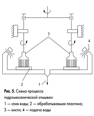 Гидромеханическая отмывка выполняется с помощью беличьих кистей или капроновых (нейлоновых) щеток, которые, совершая сложные вращательные движения (рис. 5), способствуют обновлению воды непосредственно около очищаемых пластин, увеличивают смачиваемость поверхности и механически сбивают загрязнения. Пластины крепятся вакуумным способом. Деионизованная вода подается под давлением. К недостаткам гидромеханической отмывки относятся возможность обратного перехода загрязнений с кистей (щеток) на обрабатываемые поверхности, вероятность загрязнений за счет износа кистей или щеток, необходимость периодической тщательной очистки самих щеток, кистей.