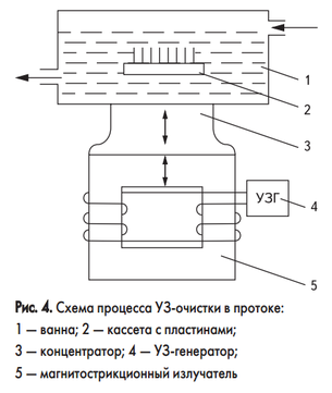 Эффективность очистки зависит от частоты и мощности УЗ-колебаний, температуры и времени обработки, а также от состава раствора, характера и степени загрязнений. С повышением частоты увеличивается проникающая способность жидкости за счет уменьшения длины волны УЗ-колебаний, уменьшается вероятность разрушения образцов за счет уменьшения размеров кавитационных пузырьков. С повышением мощности УЗ-колебаний до определенных значений интенсивность кавитации возрастает. Повышение температуры повышает растворимость загрязнений и влияет на условия возникновения кавитации. Для каждой жидкости существует оптимальная температура обработки. Обработку пластин и подложек обычно ведут при УЗ-колебаниях, когда кавитация отсутствует и очистка интенсифицируется за счет вихревых акустических протоков жидкости. УЗ-колебания значительно повышают производительность и улучшают качество не только обезжиривания, но и других операций жидкостной обработки.