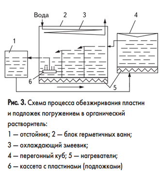 Обезжиривание (отмывка) в органических растворителях применяется для удаления с поверхности пластин (подложек) жиров животного и растительного происхождения, минеральных масел, смазок, воска, парафина и других органических и механических загрязнений (В качестве растворителей наиболее часто применяют четыреххлористый углерод, бензол, толуол, изопропиловый спирт, фреон и др., в которых эффективно растворяется большинство жировых загрязнений).