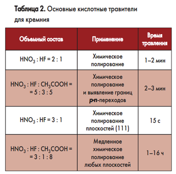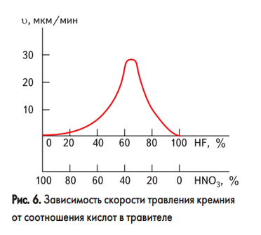Кислотное травление кремния обеспечивает получение зеркально гладкой поверхности пластин любой кристаллографической ориентации с шероховатостью от 12-го до 14-го класса. Травитель должен обладать полирующей способностью, достаточной и стабильной скоростью травления, малой истощаемостью и устойчивостью при хранении. Этим требованиям для кремния удовлетворяют травители на основе смеси азотной и фтористоводородной кислот.