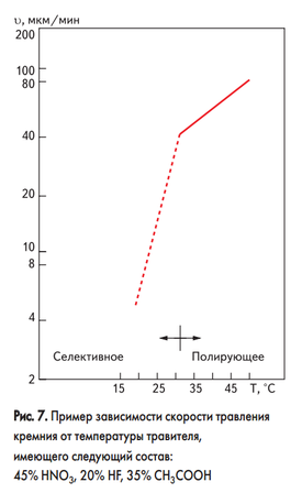 Скорость травления возрастает с увеличением температуры и концентрации травителя. Для обеспечения постоянной скорости травления необходимо перемешивание травителя, так как процесс сопровождается выделением тепла. Скорость травления максимальна при 30%-ной концентрации травителя. Травление кремния выполняют при 90–100 °С в растворах, содержащих 10–30% щелочи.
