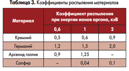 Коэффициент распыления — величина среднестатистическая и может выражаться не целым числом. Значения коэффициентов распыления основных полупроводников и сапфира при θ = 0 приведены в таблице 3.