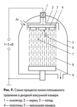 Ионно-плазменное травление выполняют в диодных или триодных камерах вакуумных установок. Травление в диодных камерах (рис. 9) проводят при постоянном или переменном ВЧ- напряжении. Пластины помещают на катоде, из камеры откачивают воздух и через игольчатый натекатель напускают аргон до рабочего давления.