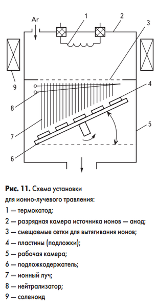 Ионно-лучевое травление выполняют в вакуумных установках, в которых луч ионов формируется специальным газоразрядным источником и системами вытягивания и ускорения ионов. Давление инертного газа в источнике (около 0,1 Па) должно быть достаточно высоким для создания газоразрядной плазмы. Для обеспечения равномерного травления по площади обрабатываемой поверхности нужно, чтобы луч ионов имел равномерное распределение плотности тока и энергии по сечению, а также был коллимированным. Луч ионов из источника направляется в рабочую камеру установки, где на вращающемся наклонном столике расположены пластины. Меняя наклон столика, можно регулировать угол падения ионов. Давление в рабочей камере должно быть существенно ниже (не более 0,04 Па), чем в источнике, чтобы предотвратить рассеяние ионного луча и загрязнение очищаемых пластин.