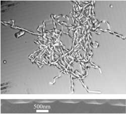 Первый способ формирования полупроводниковых нановолокон иллюстрируется на рис. 1. В верхней части схематично приведен литографический рисунок, выполненный на тонкопленочной структуре. В нижней части демонстрируется электронно-микроскопическое изображение полученных нановолокон. Обратим внимание на то, что данные волокна проявляют гибкость и прочность. На последнем этапе изготовления была применена сушка на воздухе, при этом действие капиллярных сил не разрушило волокна, а только несколько перемешало их.