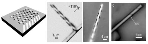 Направленное травление и ускоренное отсоединение от подложки напряженных пленок открывают новые возможности в создании нанообъектов. Рассмотрим использование многослойных структур для изготовления плотных массивов нановолокон. Для практических применений в наномеханике, магнитоэлектронике, вакуумной электронике и материаловедении необходимы нановолокна не только из полимеров, но и из полупроводников и металлов. Нановолокна из твердых тел привлекательны, прежде всего, целым рядом важных для практики свойств: высокой электропроводностью (сверхпроводимостью), механическими и магнитными свойствами, термостойкостью, прочностью. В отличие от традиционных методов производства полимерных нановолокон путем использования растворов полимеров и синтеза с использованием катализаторов мы предлагаем использовать ультра тонкие пленки. Получить нановолокна можно двумя принципиально разными способами. Первый способ предполагает наноструктурирование выращеной тонкой пленки с помощью электронной или механической литографии и ее последующее отсоединение в селективном травителе. Второй, предполагает выращивание, с помощью селективной эпитаксии, массива тонкопленочных нанополосок и их последующее отсоединение от подложки.