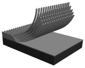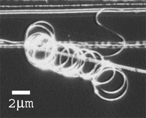 На рис. 2 показан пример одиночного нановолокна, Si/SiGe (15 нм/5 нм) нановолокно, созданное с помощью механической литографии. Экспериментальные попытки сломать, при помощи изгиба, это волокно не дали результатов. Представленные на рис. 1, 2 нановолокна получены из одиночной би-пленки. В действительности можно использовать многослойные пленки, содержащие до 300 би-слоев с компенсированными напряжениями (чередующиеся сжатые и растянутые слои), что позволит создать плотный массив волокон (рис. 3). Помещая плотный массив таких трубок в полимер, мы можем получить новый композитный материал.