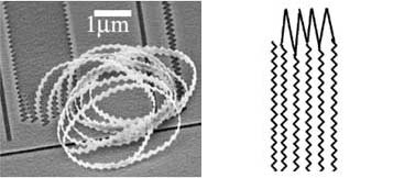Анизотропия механических свойств пленок определяет также хиральность сворачиваемых трубок рис. 4 г. Трубки, сворачиваемые на плоскости (100) в направлении («мягкое» направление), не имеют хиральности (направление сворачиваемой плоскости перпендикулярно оси трубки). Такие трубки прочные, направления атомных плоскостей совпадают во всех слоях многовитковой трубки, в результате чего происходит сращивание g слоев, образующих стенку. Если направление сворачиваемой плоскости не перпендикулярно оси трубки, формируется геликоидальная трубка. Такие трубки менее прочные, так как сращивание неполное. Очевидно, что хиральность трубок влияет и на другие физические свойства трубок – оптические, электрические, пьезоэлектрические и т.д. Экспериментально мы наблюдали, что в диаметре геликоидальные трубки больше (до 30%), по сравнению с трубками, сворачиваемыми вдоль «мягких» направлений. Примеры расчета формы оболочек, сформированных из анизотропных пленок, приведены в работе. Рис. 5 иллюстрирует гибкость и прочность спиралеобразных волокон. В верхней части фотографии изображены деформированные и залипшие под действием капиллярных сил спиралеобразные волокна (обычная сушка), волокна чрезвычайно гибкие, поэтому не разрушились. В нижней части риc. 5 - сегмент InGaAs/GaAs спиралеобразных волокон, полученных без деформации в результате сушки в суперкритическом CO2. Данная фотография иллюстрирует высокую периодичность спирали. Минимальный диаметр изготовленной нами InGaAs/GaAs наноспирали составлял 7 нм.