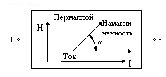 Датчик представляет собой полоску ферромагнитного материала, называемого пермаллой (20% Fe и 80% Ni). При отсутствии внешнего магнитного поля, пермаллой обладает собственным вектором намагниченности, параллельным направлению тока. При приложении внешнего магнитного поля H, параллельного плоскости пермаллоя и перпендикулярного направлению тока, собственный вектор намагниченности повернется на угол . В результате, сопротивление R изменится как функция угла поворота :