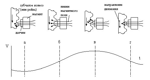 Принцип работы. Вращение ферромагнитного зубчатого колеса в магнитном поле системы датчика индуцирует в колесе вихревые токи (токи Фуко). При этом генерируется напряжение смещения нуля на выходе датчика, которое линейно возрастает с ростом скорости вращения. Максимальный зазор незначительно уменьшается на высоких частотах.