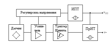 Выходной сигнал датчика проходит через ЭМС фильтр, усиливается и дискретизируется посредством компаратора, имеющего встроенный гистерезис переключения, выполненный на триггере Шмитта. Стабилизатор напряжения обеспечивает датчик, усилитель и компаратор напряжением 5 В. (см. рис.6).