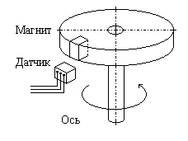 Магнит, установленный на оси вращения, при каждом обороте проходит один раз мимо магниторезистивного датчика, вызывая изменение его сопротивления (см. рис.1).
