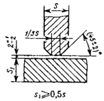 При разности в толщине свариваемых деталей свыше значений, указанных в табл. 55, на детали, имеющей большую толщину s1, должен быть сделан скос с одной или двух сторон до толщины тонкой детали s, как указано на черт. 2, 3 и 4. При этом конструктивные элементы подготовленных кромок и размеры сварного шва следует выбирать по меньшей толщине.