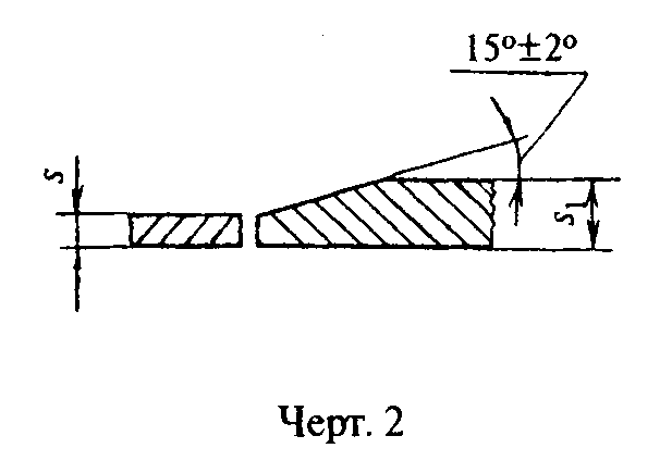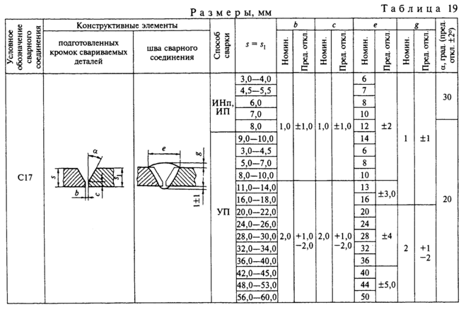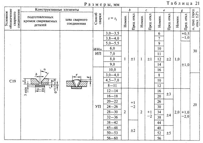 19. При подготовке кромок с применением ручного инструмента предельные отклонения угла скоса кромок могут быть увеличены до +- 5°. При этом соответственно может быть изменена ширина шва е, е_1.