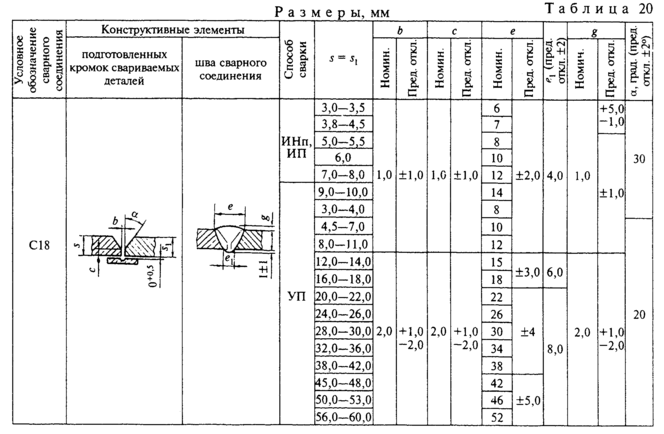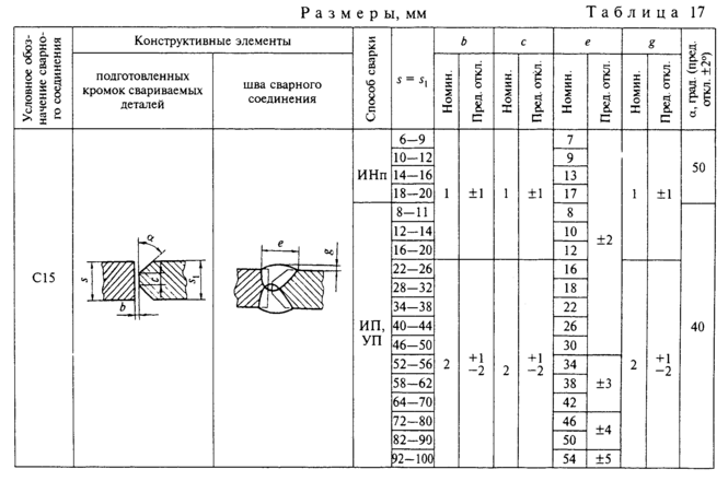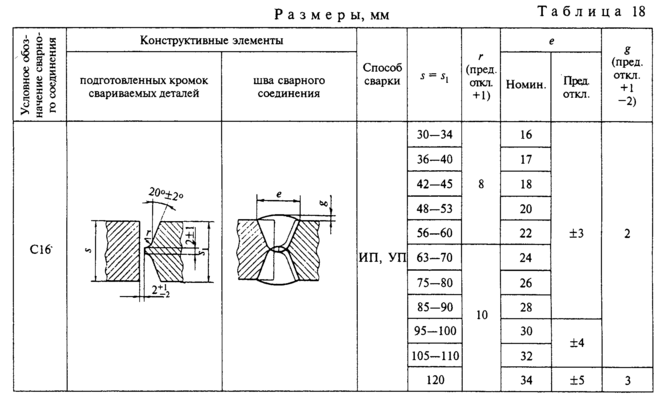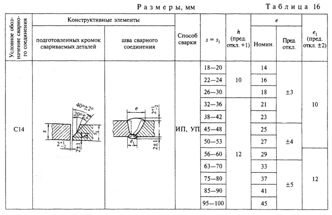 17. В стыковых, тавровых и угловых соединениях толщиной более 16 мм, выполняемых в монтажных условиях, допускается увеличение номинального значения размера b до 4 мм. При этом соответственно может быть увеличена ширина шва, е, е_1.