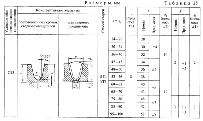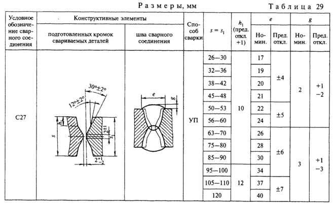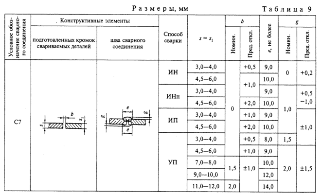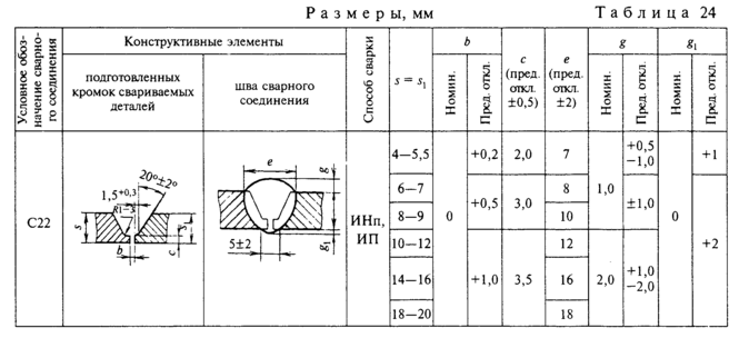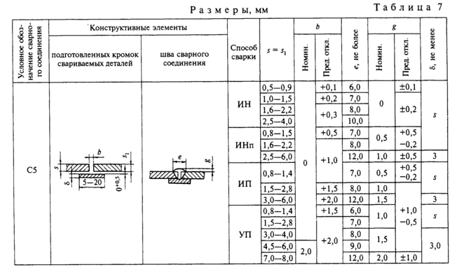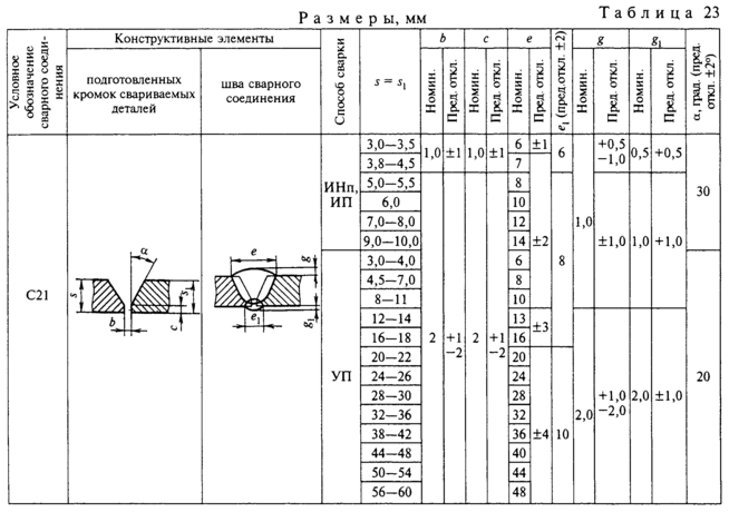 6. Для сварных соединений С12, С21, С23, С24, У7, У10, Т7, имеющих толщину деталей s = 12 мм и более, а также для соединений С15, С16, С25, С27, У8, Т8, имеющих толщину деталей s = 20 мм и более, выполняемых способом сварки УП, допускается притупление с = 5 +- 2 мм.