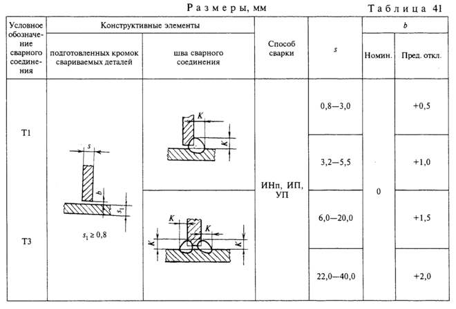 8. Размер и предельные отклонения катета углового шва К и К_1 должны быть установлены при проектировании. При этом размер катета должен быть не более 3 мм для деталей толщиной до 3 мм включительно и 1,2 толщины более тонкой детали при сварке деталей толщиной свыше 3 мм. Предельные отклонения размера катета угловых швов от номинального значения приведены в приложении 4.