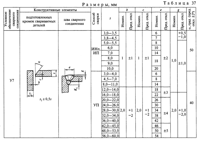 7. Сварка встык деталей неодинаковой толщины в случае разницы по толщине, не превышающей значений, указанных в табл. 48, должна производиться так же, как деталей одинаковой толщины; конструктивные элементы подготовленных кромок и размеры сварного шва следует выбирать по большей толщине.