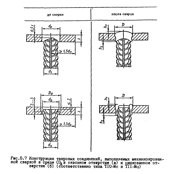 5.2.1. Конструкции и размеры тавровых соединений арматуры с элементами проката, выполняемые механизированной сваркой в среде углекислого газа типа Т10-Мс и Т11-Мц, должны соответствовать приведенным на рис. 5.7 и в табл. 5.4.