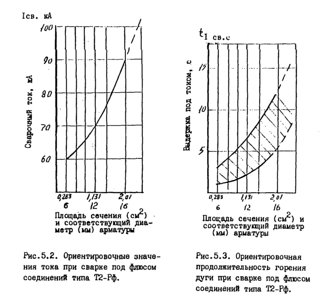 5.1.3. Основными параметрами режима дуговой сварки под флюсом являются: сварочный ток, величина начального дугового промежутка, т.е. первоначальный зазор, который следует обеспечить при возбуж;ении дуги, продолжительность горения дуги, ориентировочная величина осадки стержня в ванну расплавленного металла и продолжительность выдержки стержня в ванне остывающего (кристаллизующегося) металла. Значения этих параметров сварки для арматуры диаметром до 16 мм приведены на рис. 5.2, 5.3 и в табл. 5.2.
