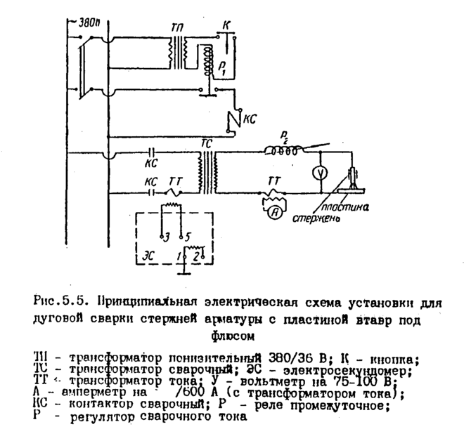 Перед началом сварки стержни и пластины должны быть очищены от ржавчины, отпадающей окалины, масла, грязи и т.д. Плоские элементы проката укладываются (подаются) на стол устройства, к которому плоские детали, например, пластины, прижимаются вручную или механически. Арматурные стержни (анкеры) зажимают в держателе эксцентриковыми или пневматическими прижимами. К плоским деталям через опорный стол и к держателю подается напряжение от источника питания (рис. 5.5). Через систему рычагов арматуру прижимают торцом к пластине, затем это место засыпают слоем флюса, его насыпная высота ограничивается цилиндрической или прямоугольной флюсоудерживающей деталью устройства. Нажатием кнопки (К) замыкают цепь реле (Р_1, которое замыкает цепь контактора (КС), включающего в сеть первичную обмотку сварочного трансформатора (ТС). В этот момент сварщик системой рычагов отрывает торец стержня от поверхности пластины на высоту начального дугового промежутка (табл. 5.2), зажигается электрическая дуга, которую поддерживают в течение всего времени сварки. При необходимости стержень медленно опускают вниз и по истечении времени горения дуги его резко опускают в ванну расплавленного металла, отпускают кнопку (К), прекращая сварку.