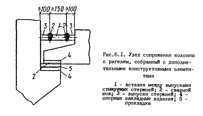 6.1.6. Длина каждого выпуска арматуры из тела бетона должна быть не менее 150 мм при нормальных зазорах между торцами стержней и 100 мм при применении вставки (рис. 6.1). Следует стремиться изготовлять изделия так, чтобы длина выпусков позволяла вести монтаж и сварку без вставок (т.е. подгонку зазора между выпусками производить на месте монтажа, используя газовую резку. При величине зазора в 2-3 раза больше регламентированного допускается привести его к нормируемому путем дуговой наплавки (см. п. 6.1.5).