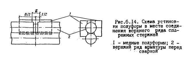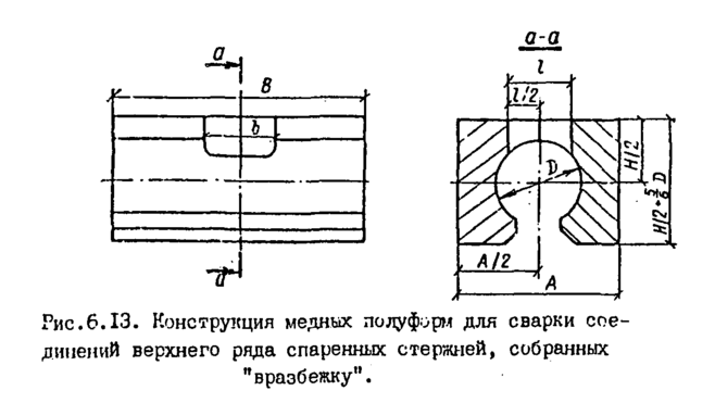 верхний ряд стержней следует соединять двумя стыками через вставку. Для обеспечения процесса сварки следует применять две медные полуформы (рис. 6.13), ограждающие плавильное пространство с боков и сверху. Снизу плавильное пространство ограничивается нижним рядом стержней.