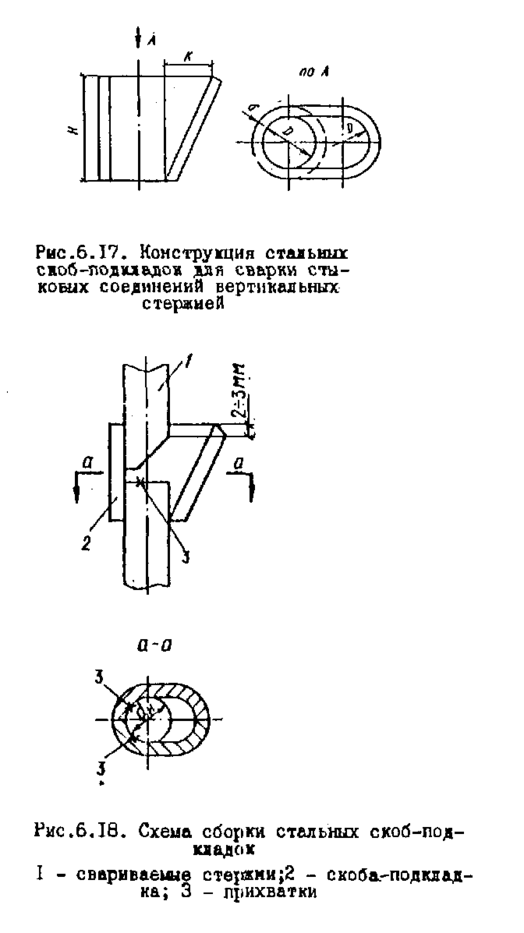 Схематично на рис. 6.17 показана конструкция одной половины полускобы и двух полускоб в сборке. Две полускобы могут собираться на выпусках арматуры на прихватках (рис. 6.18). Полускобы могут собираться отдельно и в месте их сопряжения свариваться сплошным швом. Это упрощает сварку, препятствуя вытеканию жидкого металла и шлака. Техника сварки в этом случае близка к приведенной выше, но зачастую возникает необходимость в процессе сварки прожигать отверстия для выпускания лишнего, мешающего варить, шлака.
