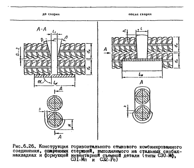 6.9.4. Комбинированное стыковое соединение спаренных стержней осуществляется в одном сечении при режимах и технике сварки, приведенных в п. 6.3.5 с учетом использования стильных скоб-накладок по пп. 6.8.5-6.8.7.