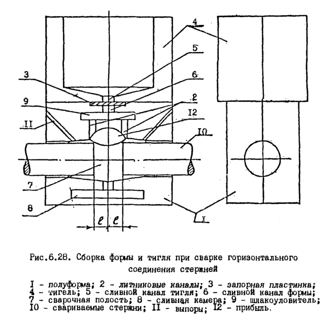 6.11.3. Термитная сварка стержней арматуры осуществляется в двухкамерных формах по схеме, представленной на рис. 6.27, в следующей последовательности: