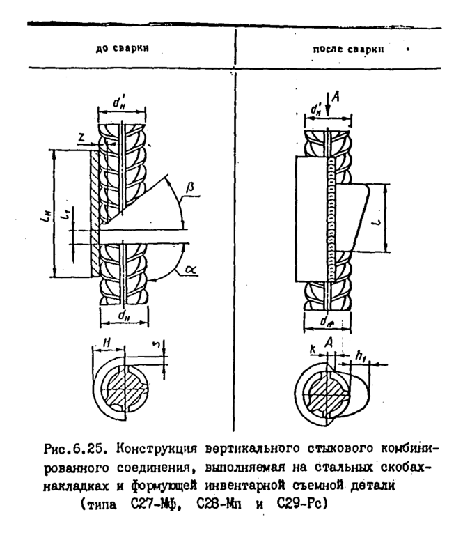 6.8.9. Конструкция и размеры стыкового комбинированного соединения вертикальных стержней типа С27-Мф должны соответствовать приведенным на рис. 6.25 и в табл. 6.17, используя, как правило, разделку со скосом верхнего стержня. Допускается разделка со скосом нижнего стержня "на себя".