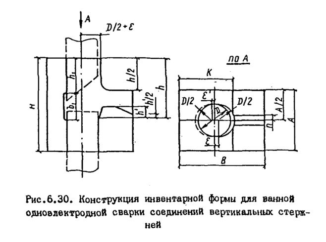 6.14.3. Конструкцию и размеры форм для сварки одинарных вертикальных стержней ванной одноэлектродной сваркой следует применять по рис. 6.30 и табл. 6.19.