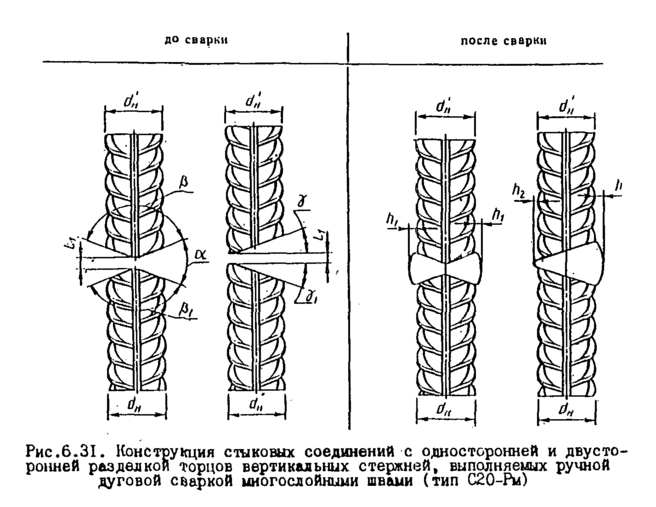 6.17.1. Конструкция и размеры стыкового соединения вертикальных стержней при сварке многослойными швами без дополнительных формующих и технологических элементов типа С20-Рм должны соответствовать указанным на рис. 6.31 и в табл. 6.21.