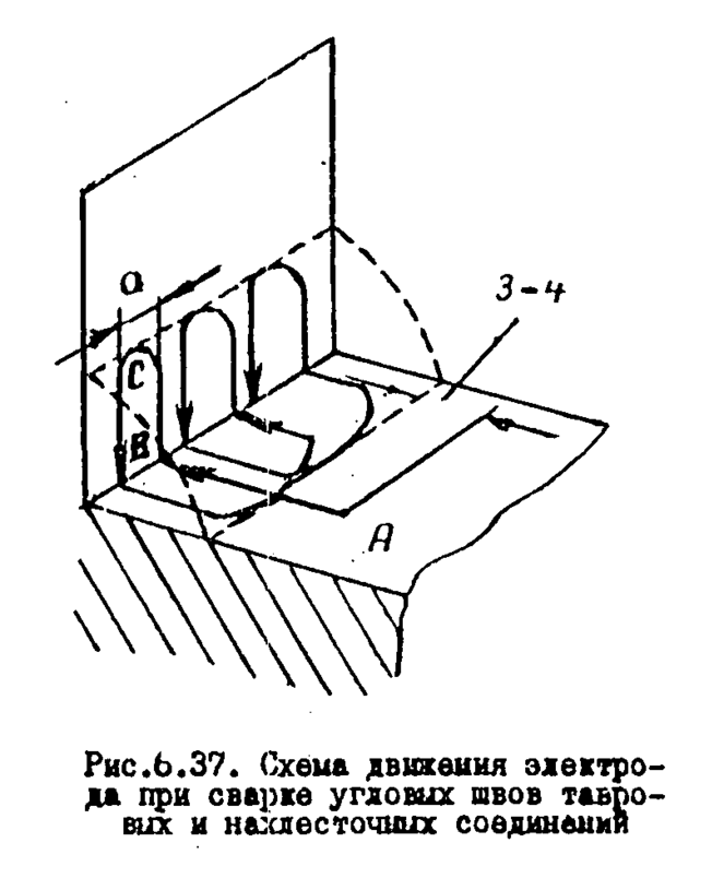 6.18.12. Валиковые (угловые) швы тавровых и нахлесточных соединений в нижнем положении следует выполнять по схеме, представленной на рис. 6.37. Наибольшие трудности при сварке таких швов состоят в том, что необходимы достаточные навыки по обеспечению провара одной из сторон (горизонтальной или вертикальной) сопрягаемых стальных элементов, а также возможности непровара угла - корня шва этих элементов.
