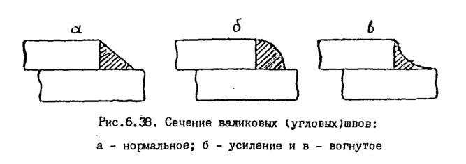 При сварке электрод следует располагать в плоскости, делящей угол пополам, и концу электрода сообщают колебательные движения (рис. 6.37). Дугу возбуждают на нижнем элементе, отступив от вершины угла на 3-4 мм больше величины катета шва (точка А), затем ее ведут от точки А к вершине угла в точку В, где несколько задерживают электрод для лучшего проплавления вершины угла; далее дугу поднимают на высоту, равную катету шва на вертикальной плоскости (при многослойной сварке - на высоту, равную катету первого слоя шва) и по ней перемещают назад на расстояние "а", равное 3-5 мм. После этого дугу быстрей, чем при подъеме, опускают на горизонтальный нижний элемент и наплавляют на нем шов толщиной, равной величине заданного катета. Сечения валиковых (угловых) швов, показанные на рис. 6.38, а, б, в. Наиболее просты и достаточно экономичны швы с нормальным сечением, нерациональны так называемые усиленные швы. Они неэкономичны, менее производительны и не повышают прочность сварного сечения. Вогнутые швы экономичны, хорошо ведут себя в конструкциях, работающих при цикловых нагрузках, но их выполнение затруднено. При технической необходимости такое сечение шва получают путем механической обработки.