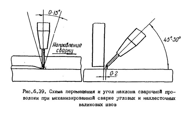 6.19.3. При сварке угловых швов конец проволоки следует направлять перпендикулярно или с наклоном до 15° от вертикального положения в направлении сварки и под углом 45-50° между горизонтальной плоскостью и проволокой (рис. 6.39). Перемещение конца проволоки такое же, как при ручной дуговой сварке электродами. При сварке на повышенных токах, особенно при наличии зазора между свариваемыми элементами, дугу следует направлять не на вершину угла, а на горизонтальную пластину на расстоянии 2-4 мм от вершины угла.