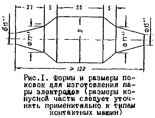 2. Поковку следует изготовлять горячим способом. Форма и размеры поковок для пары электродов к одноэлектродным машинным для сварки пересекающихся стержней показаны на рис. 1. Для остальных машин форма поковок должна быть подобной приведенной на рис. 4.2 и описаниям к многоточечным машинам.