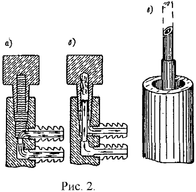 3. Трубка должна иметь достаточную длину, чтобы ее скошенный конец был близок ко дну канала в электроде. При короткой трубке в канале также образуется паровая пробка (рис. 2, б).
