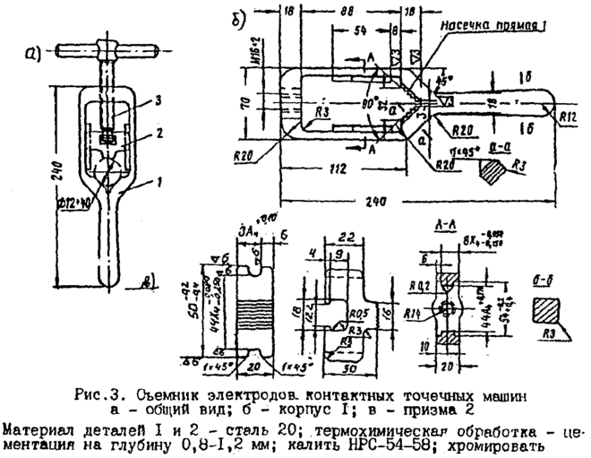 Для удаления электродов из свечей контактных точечных машин рекомендуется применять специальные съемники. Для электродов наиболее ходовых размеров диаметром до 40 мм включительно рекомендуется съемник НИАТ (рис. 3).