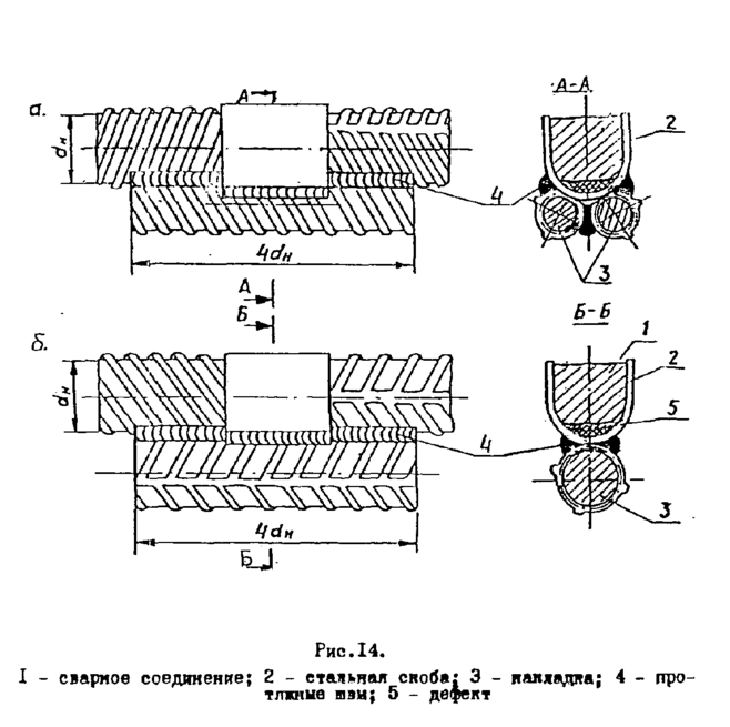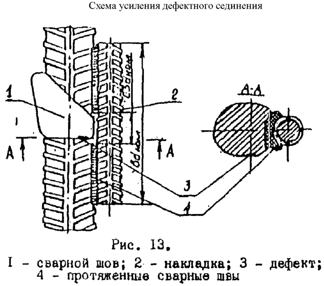2. Для усиления дефектных соединений, отбракованных по баллу 2, следует использовать арматуру из стали той же марки, что и стыкуемые стержни. Площадь круглой накладки (накладок) назначается из условий статической прочности соединений, удобства сварки и должна составлять: