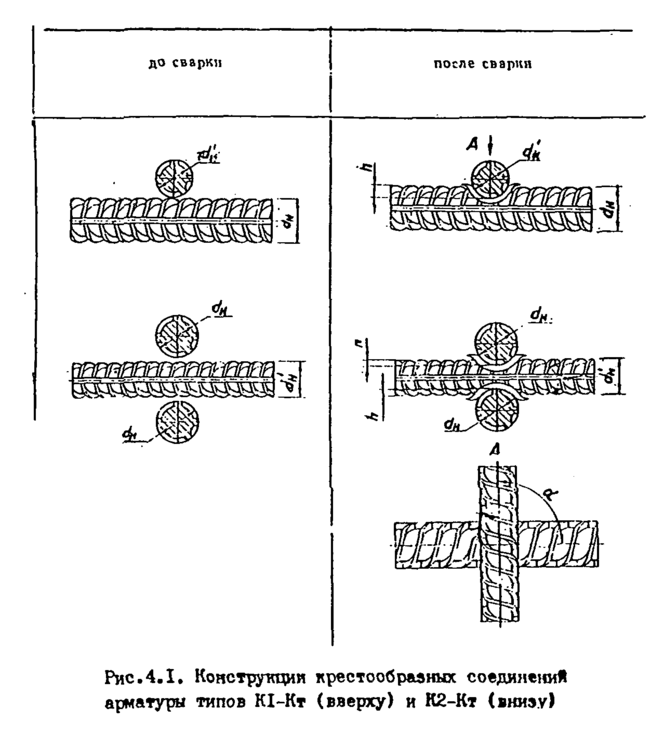 4.1.1. Конструкции крестообразных соединений арматуры типа K1-Кт и К2-Кт, выполняемые контактной точечной сваркой, приведены на рис. 4.1 и в табл. 4.1.