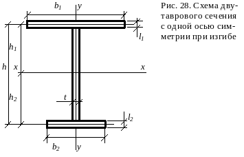 2. Для балок двутаврового сечения с одной осью симметрии (рис. 28) для определения коэффициента b необходимо вычислить коэффициенты 1 и 2 по формулам: