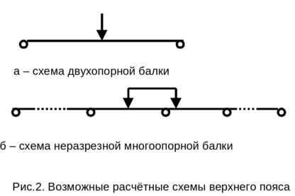 При проверке верхнего пояса на статическую прочность необходимо в начале задаться расчётной схемой. Наиболее просто исходить из того, что ферма является конструкцией с шарнирным соединением стержней. В этом случае можно использовать схему двухопорной балки, нагруженной сосредоточенной силой по середине пролёта балки (рис.2а). Сила действует в вертикальной и горизонтальной плоскостях и равна значению давления колеса тележки в этих плоскостях. Другой расчётной схемой (рис.2б), более точно отражающей работу верхнего пояса, является схема неразрезной многоопорной статически неопределимой балкой, нагруженной двумя сосредоточенными силами в двух плоскостях. Одна из этих сил расположена по середине пролета между опорами, а другая отстоит от первой на величину, равную расстоянию между колёсами грузовой тележки.