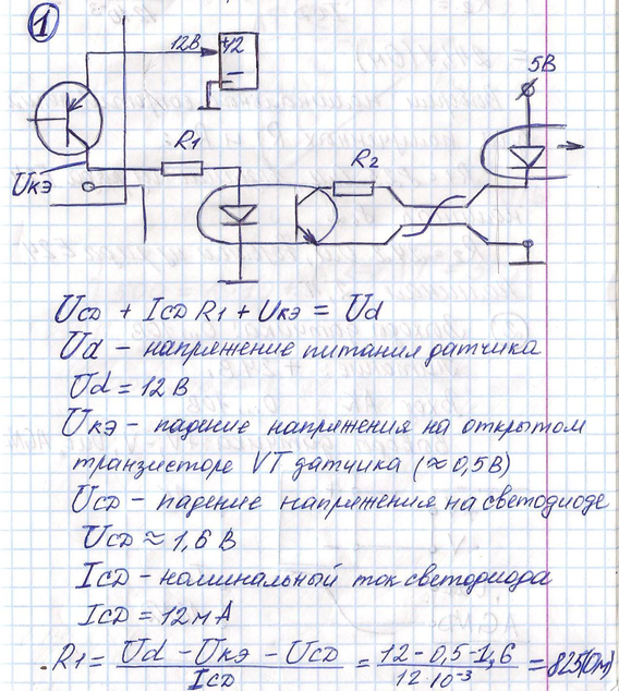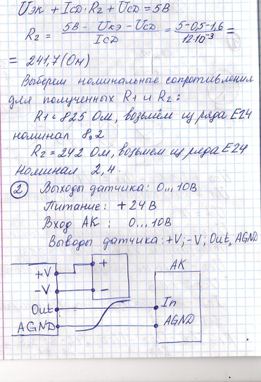1. Подключить активный датчик с выходом «Открытый коллектор p-n-p» и питанием 12 В к контроллеру со входом «Открытый катод СД». Рассчитать балластный резистор светодиода, если анод получает питание +5 В, номинальный ток светодиода – 12 мА.