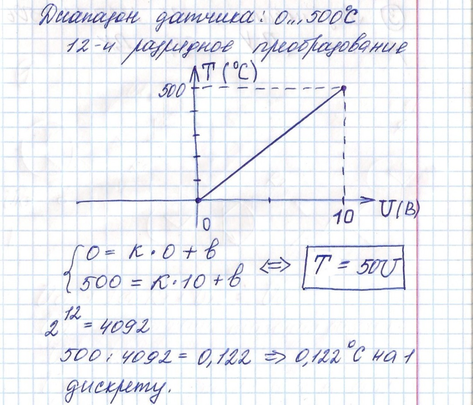 2. Обеспечить подключение датчика температуры с диапазоном 0..500°С, потенциальным выходом 0..10 В и питанием +24 В к входу АК контроллера 0..10 В. Выводы датчика +V, -V, Out, AGND. Рассчитать и построить характеристику Т(U). Сколько градусов приходится на дискрету, если преобразование 12-и разрядное.