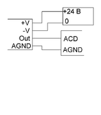 Обеспечить подключение датчика давления с диапазоном 0..100 кПа, потенциальным выходом 0..10 В и питанием +24 В к входу АК контроллера 0..10 В. Выводы датчика +V, -V, Out, AGND. Рассчитать и построить характеристику Р(U). Сколько Паскалей приходится на дискрету, если преобразование 12-и разрядное.