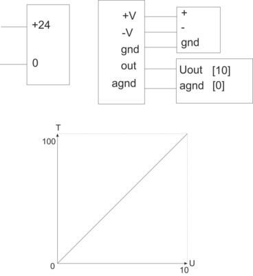 2. Обеспечить подключение датчика температуры с диапазоном 0..100°С, потенциальным выходом 0..10 В и питанием +24 В к входу АК контроллера 0..10 В. Выводы датчика +V, -V, Out, AGND. Рассчитать и построить характеристику Т(U). Сколько градусов приходится на дискрету, если преобразование 12-и разрядное.
