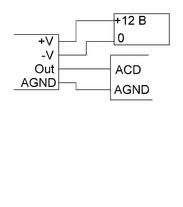 Обеспечить подключение датчика температуры с диапазоном 0..100°С, потенциальным выходом 0..10 В и питанием +12 В к входу АК контроллера 0..10 В. Выводы датчика +V, -V, Out, AGND. Рассчитать и построить характеристику Т(U). Сколько градусов приходится на дискрету, если преобразование 10-и разрядное.